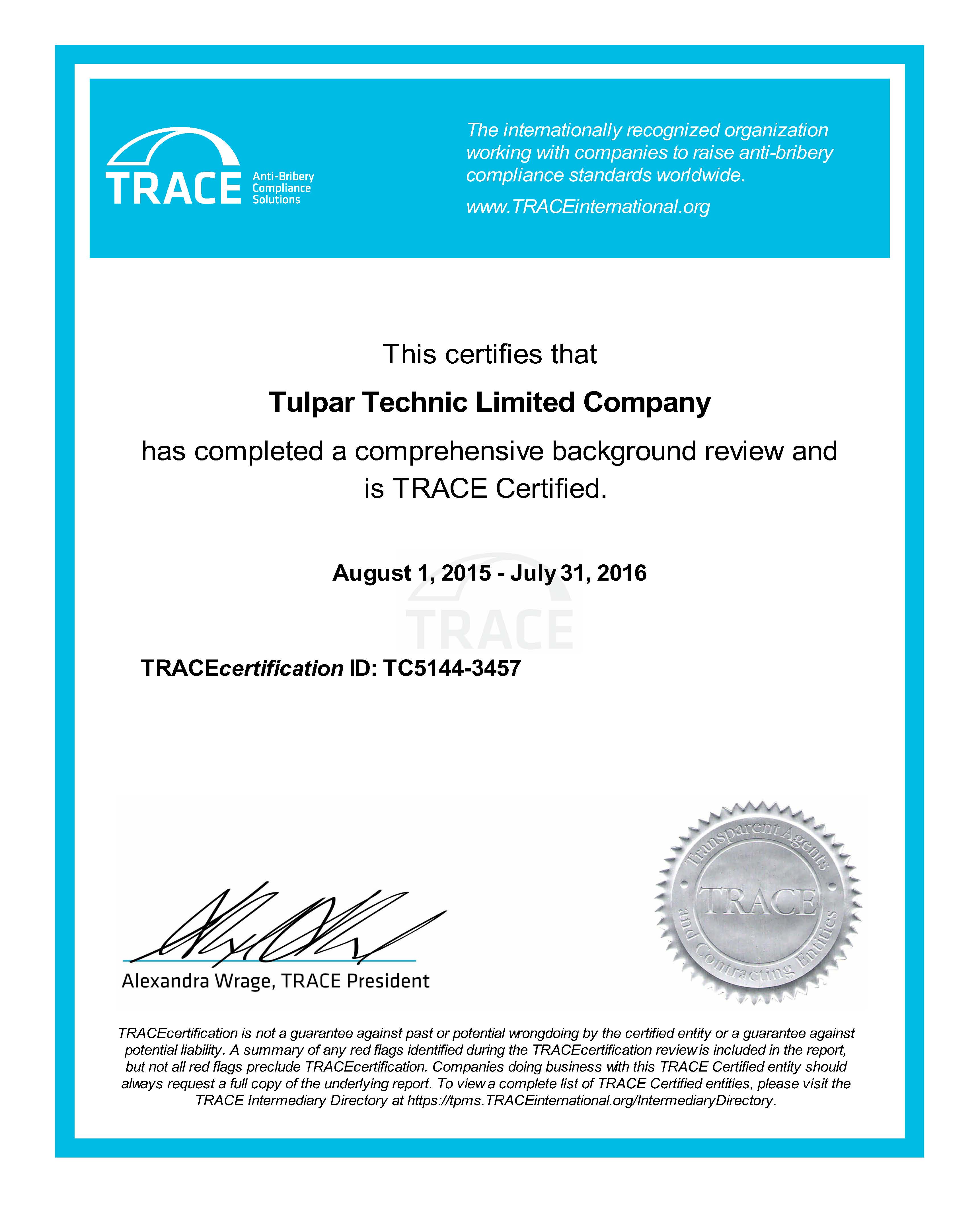 ООО «Тулпар Техник» пролонгировало членство компании TRACE до 31 июля 2016 года.