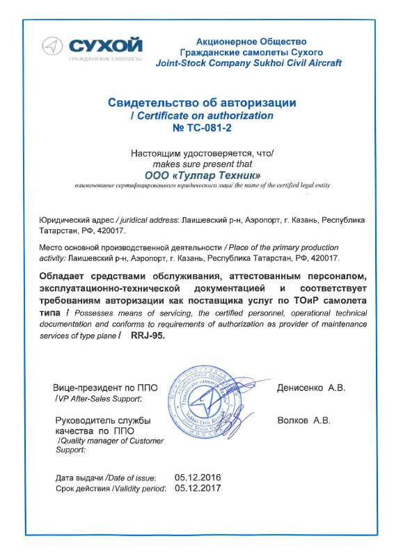 Данное Свидетельство подтверждает, что ООО «Тулпар Техник» обладает всеми необходимыми средствами наземного обслуживания, инструментом, инженерно-техническим персоналом и эксплуатационно-технической документацией для оказания услуг по ТОиР RRJ-95.