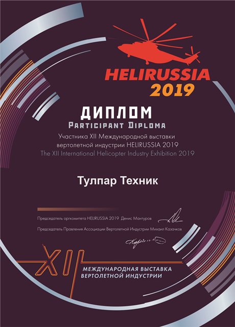 Группа компаний «Тулпар» (ООО «Тулпар Техник», ООО «Авиакомпания Тулпар Эйр», ООО «Тулпар Интерьер Групп») приняли участие в двенадцатой международной выставке вертолетной индустрии «HeliRussia 2019» в Международном выставочном центре, Крокус Экспо г. Москва.