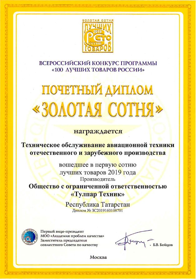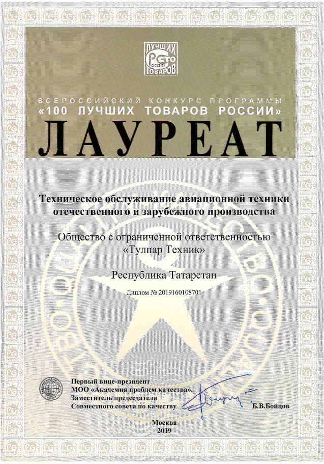 По итогам Всероссийского конкурса «100 лучших товаров России-2019» Тулпар Техник вошел в состав «Золотой сотни» Программы «100 лучших товаров России» и удостоен почетного диплома Совета организаторов Программы. Из Республики Татарстан только 5 организаций вошли в этот список.