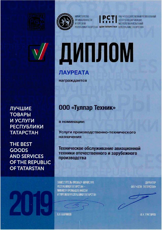 Тулпар Техник стал лауреатом конкурса «Лучшие товары и услуги РТ-2019», получил наивысшую награду «Лидер качества РТ» в 2019 году.